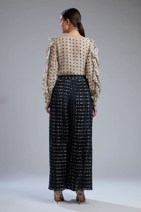 Off white top with polka dots all over & layered frill bodice & sleeves.