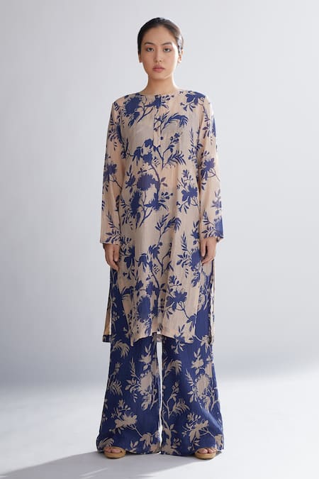 Peach kurta with all-over blue floral prints inspired from ancient dabu technique.