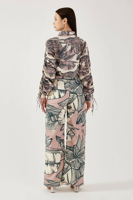 White and pink floral pattern shirt featuring gathered sleeves and a collared neckline