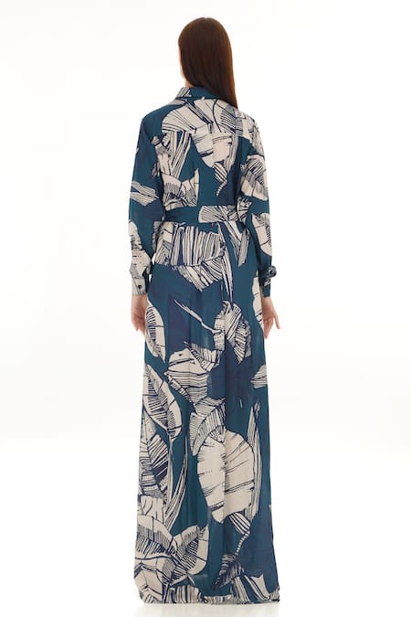 Blue long shirt dress featuring all-over floral patterns and a shirt collar