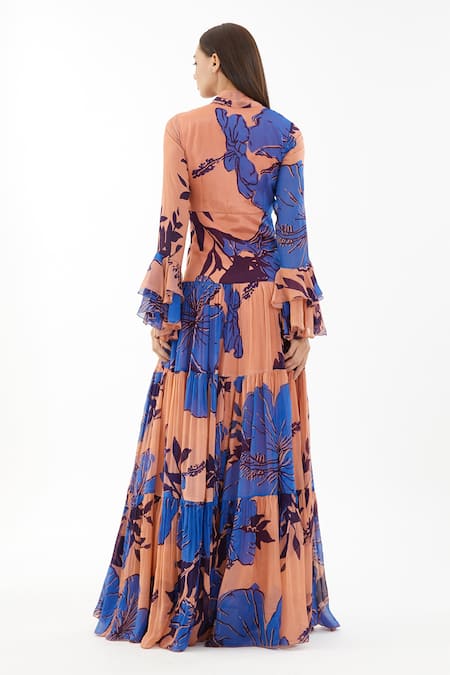 Blue and orange tiered dress in chiffon base with all over floral pattern.