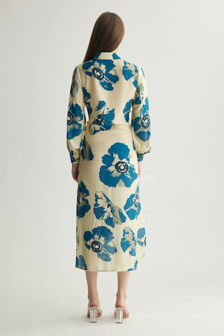 Blue Muslin, Cotton, Silk Embroidery Floral Print Balloon Sleeve Shirt Dress