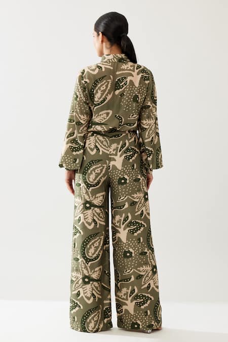 Green Cotton, Silk Embroidery Collared Floral Print Long Shirt