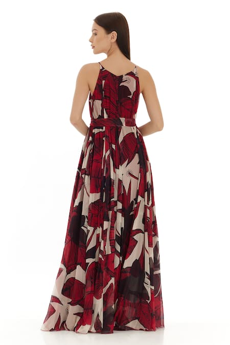 Red and off white floral printed maxi dress in chiffon fabric featuring a round neckline and sleeveless design
