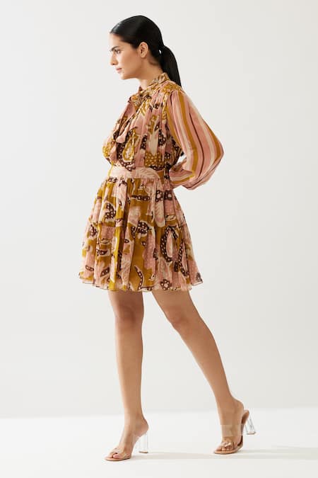 Pink and mustard yellow short tiered skirt featuring floral prints