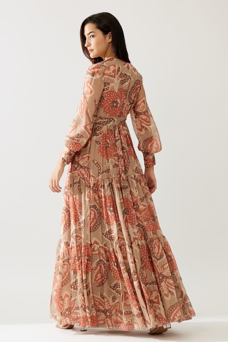 Side tie-up detail, Long cuffed sleeves, Tiered ruffle hem