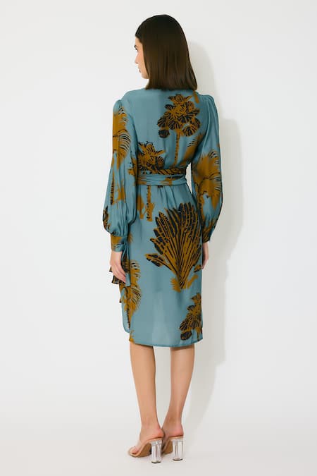 Sky blue wrap dress featuring mustard floral prints and long puff sleeves