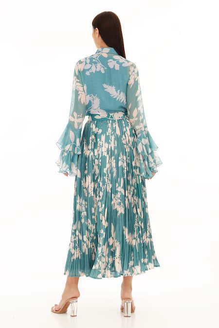 Blue shirt featuring all-over foliage patterns and ruffle detail with bell sleeves