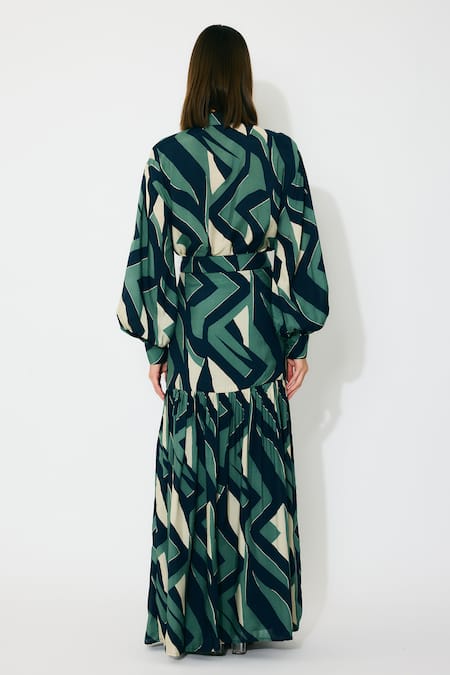 Button detailing along the front, Tiered hem design, Unique geometric pattern