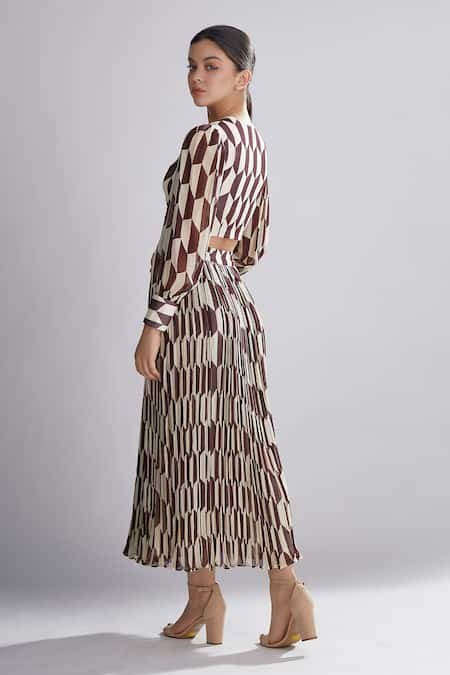Brown & cream flared maxi skirt with all-over geometric motif work & pleated detail.