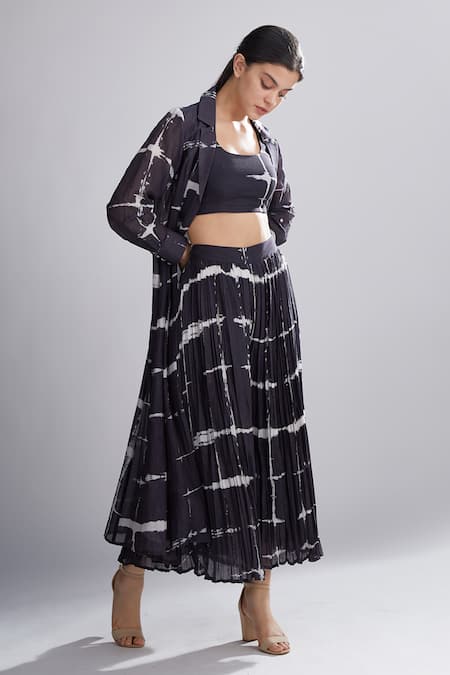 Black high-waist midi skirt with all over Shibori tie-dye motifs and pleated detail.