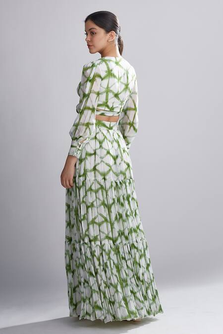 Cream crop top with all over Shibori tie-dye motifs & tie-up styling.
