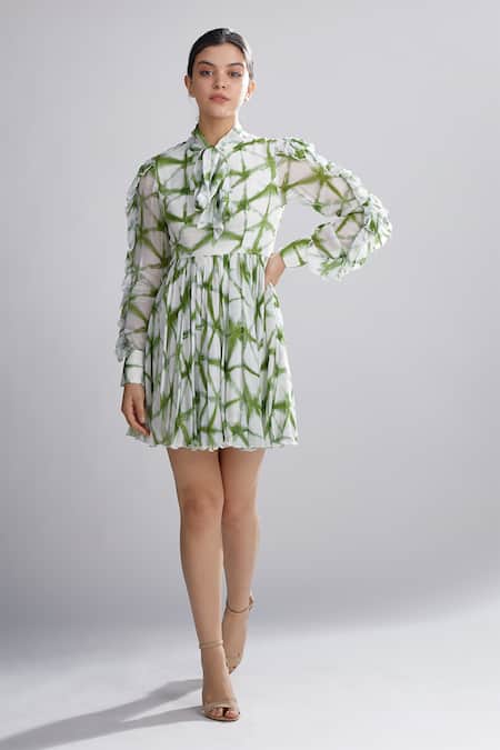 Cream A-line dress with all over Shibori tie-dye motifs & ruffled detail on the sleeves.