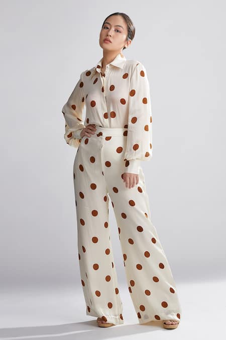 Beige silk shirt featuring brown polka dot motifs and bishop sleeves