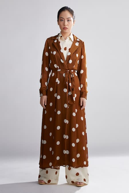 Brown front-open trench- jacket with all-over cream polka dotted motifs.
