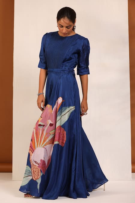 Buy_Koashee By Shubitaa_Blue Bemberg Silk, Lining Cambric Floral Round Pattern Pleated Jumpsuit _Online_at_Aza_Fashions