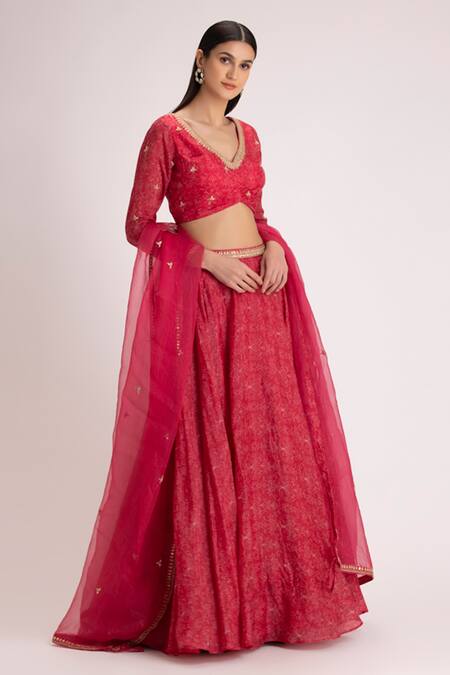 Red Silk Organza Floral V Neck Print Lehenga Set