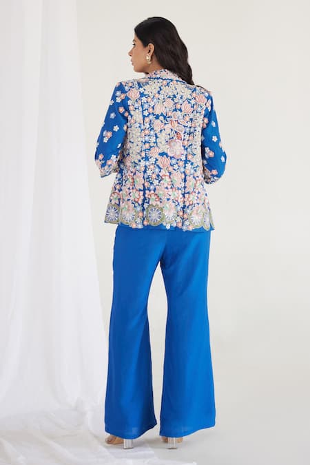 Royal blue silk jacket featuring floral resham and zardozi embroidery. Paired with an embroidered bustier and flared pants made from handloom fabric.