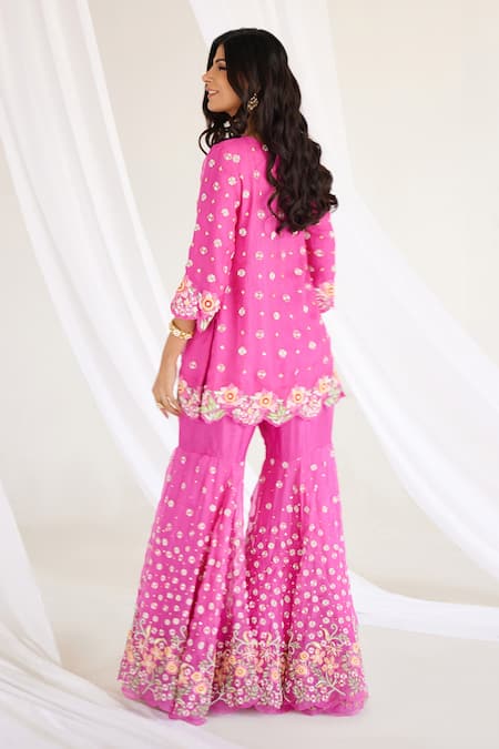 Pink silk kurta featuring resham and zardozi embroidery with a floral embroidered placket. Accompanied by a matching floral embroidered sharara and organza dupatta.