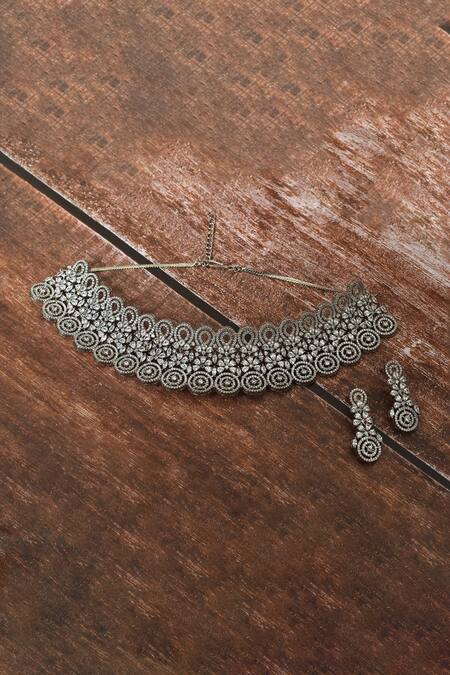 Silver finish choker embellished with faux diamonds and has cutwork detailing. Comes with dangler earrings.