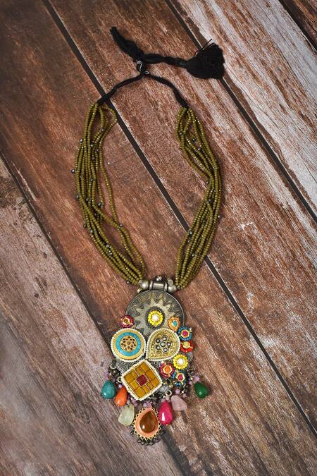 Green Semi Precious Stones Embellished Tribal Long Necklace
