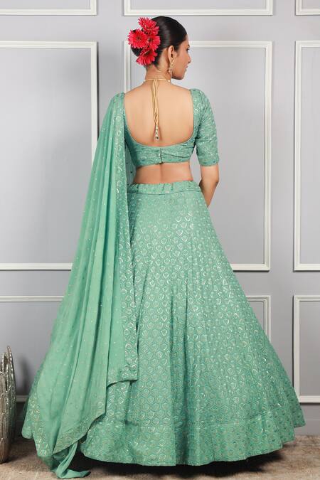 Green lehenga featuring floral thread embroidery and sequins. Paired with a padded blouse and dupatta, all made from georgette fabric.