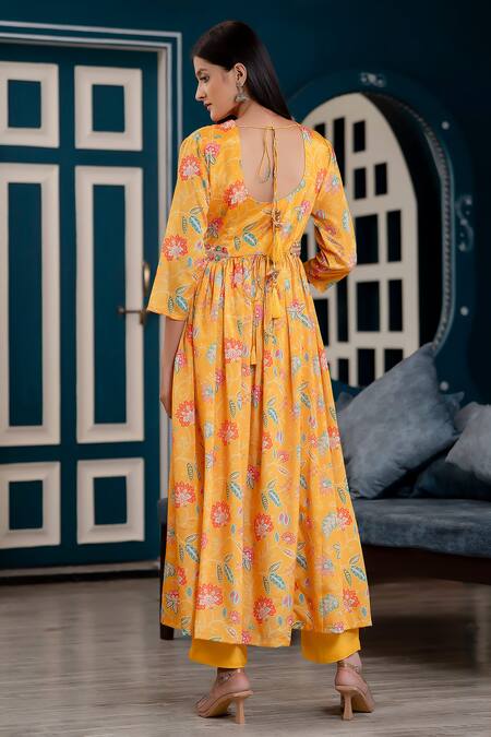 Yellow Chinon Printed Floral V-neck Jaal Anarkali Pant Set