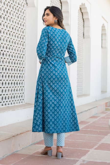Blue hand block print jacket featuring floral motifs and a tasselled drawcord. Paired with a matching inner top and slip-on pant.