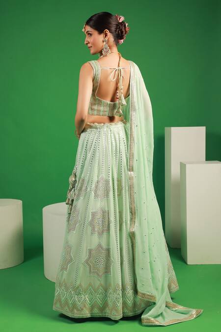 Green lehenga featuring mirrorwork embellished floral geometric motifs. Paired with a padded blouse and dupatta in georgette fabric.