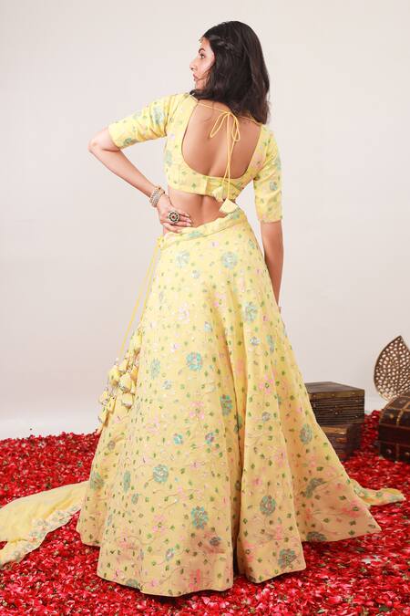 Yellow lehenga featuring sequin embroidered blossom patterns and attached can can. Paired with a padded V-neck blouse and matching dupatta.