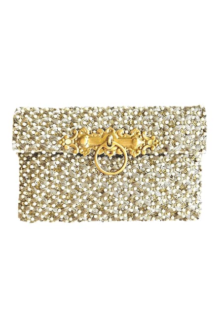 Hand embroidered with aari threads, sequins, and pearls., Solid brass clasp with O-ring detail.