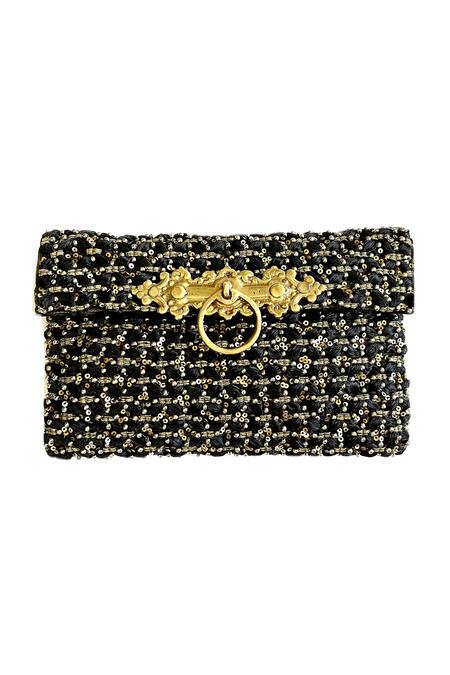 Black clutch featuring hand embroidery with aari threads, sequins, and pearls