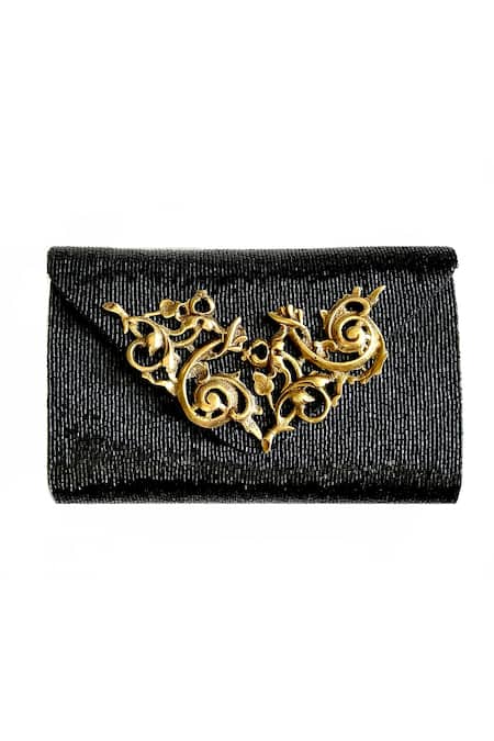 Black clutch featuring baroque embellishment on a hand cast solid brass and hand embroidered beaded base