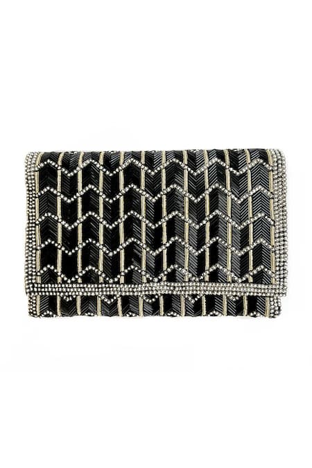 Black clutch featuring hand embroidery with bugle beads, sequins, pearls, and zardozi in a chevron pattern