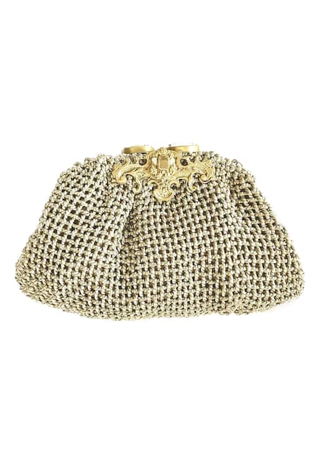 Silver clutch featuring textured aari embroidery with corded and woven patterns