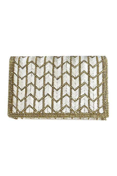White clutch featuring hand embroidery with bugle beads, sequins, pearls, and zardozi in a chevron pattern