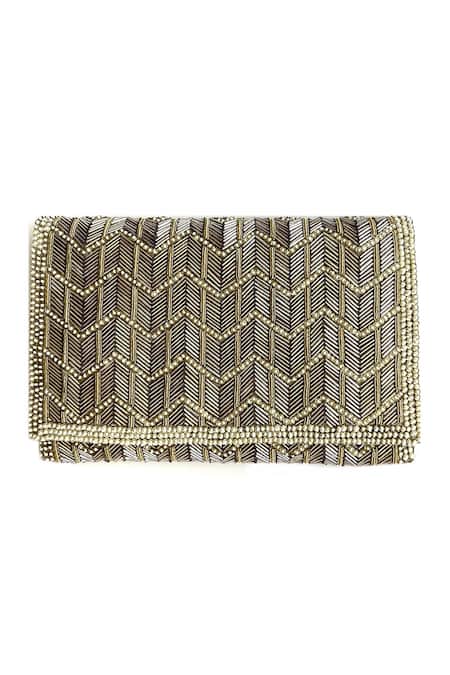 Grey clutch featuring hand embroidery with bugle beads, sequins, pearls, and zardozi in a chevron pattern