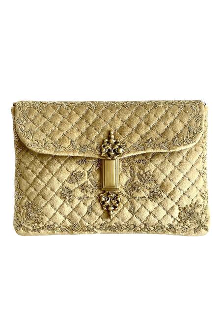 Gold clutch in luxe quilted velvet featuring hand embroidered zardozi work