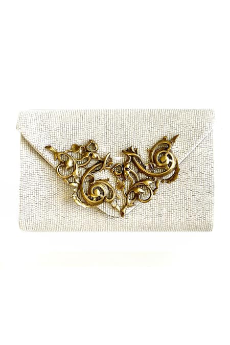 White clutch featuring baroque embellishment on a hand cast solid brass base