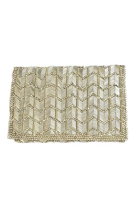Silver clutch featuring hand embroidery with bugle beads, sequins, pearls, and zardozi in a chevron pattern