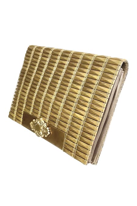 Gold clutch featuring linear pattern hand embroidery with pure leather trims