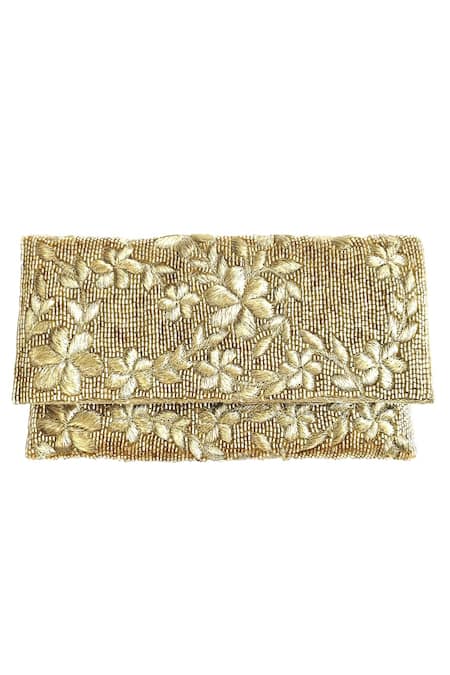Gold clutch featuring hand embroidery in aari thread and delicate glass beads with a floral pattern
