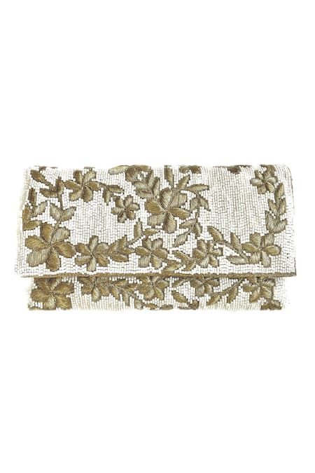 White silk clutch featuring intricate hand embroidery in aari thread with delicate glass beads in a floral pattern