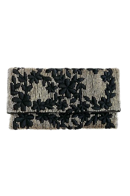 Black clutch featuring hand embroidery in aari thread and delicate glass beads in a floral pattern