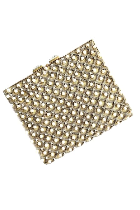 Gold Hand Embroidered Scalloped Pearl Clutch