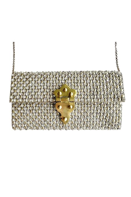 Encrusted embroidery of faux diamonds and sequins, Brass clasp with unique design, Quilted silk lining for added luxury
