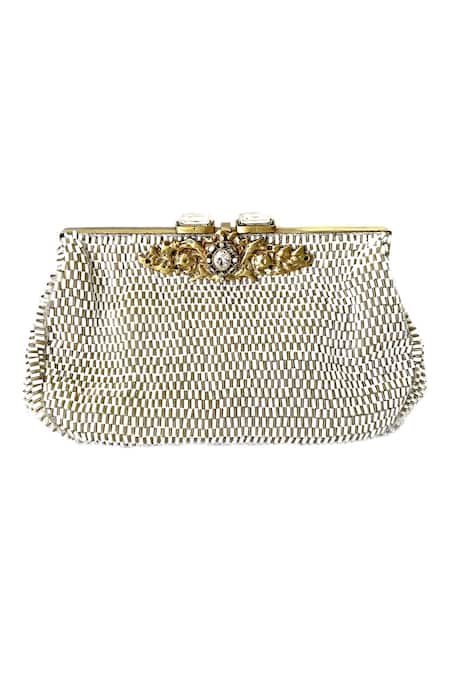 White clutch featuring hand embroidery with micro glass beads and a solid brass handcast embellishment