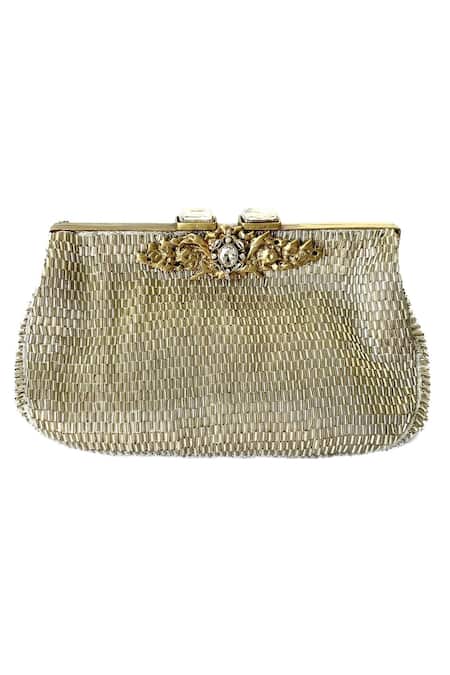 Silver clutch featuring hand embroidery with micro glass beads and embellished with a solid brass handcast piece