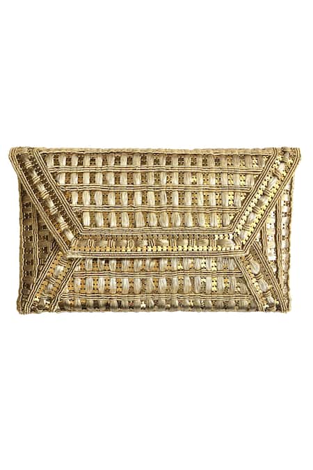 Gold rectangular-shaped flap clutch featuring hand embroidered aari work and quilted silk lining