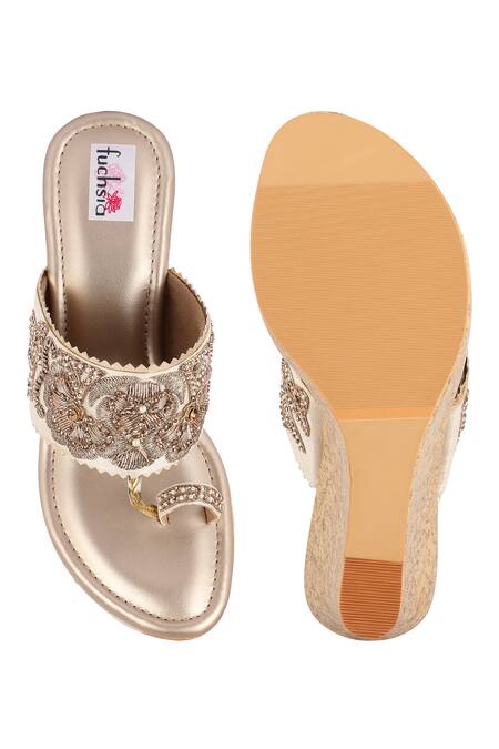 Beige and off-white Kolhapuri wedges featuring criss-cross straps and floral motif hand zardozi work